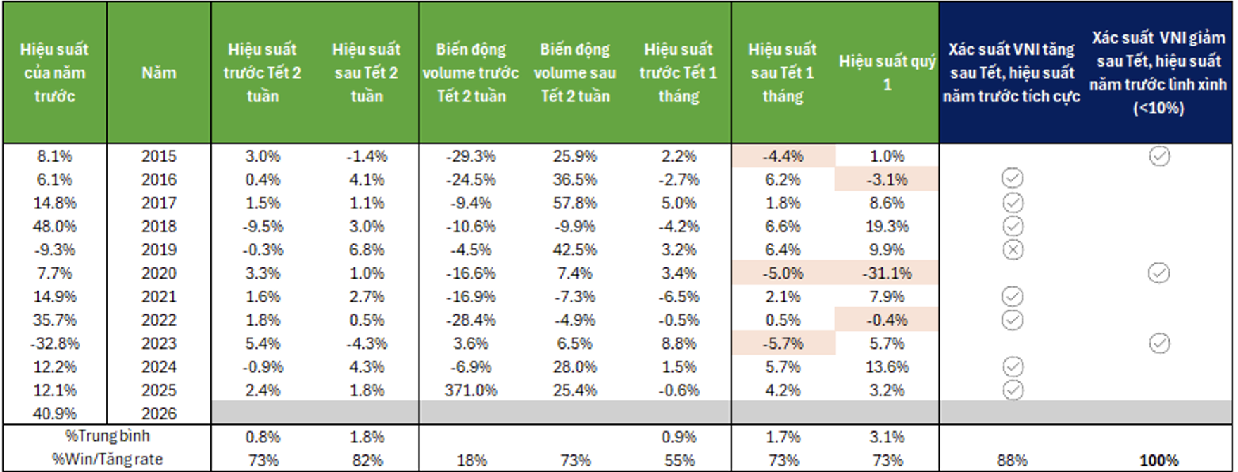 Đáng chú ý, thống kê lịch sử của thị trường cho thấy triển vọng tích cực hơn đối với hiệu suất giai đoạn sau Tết. Khi đối chiếu với diễn biến của thị trường trong năm liền trước, có thể nhận định rằng vận động sau Tết phần nào được nâng đỡ bởi "bộ đệm lợi nhuận" đã hình thành từ trước, qua đó tạo ra tâm lý dòng tiền đồng thuận, sẵn sàng quay lại thị trường và tìm kiếm cơ hội đầu tư trong năm mới.